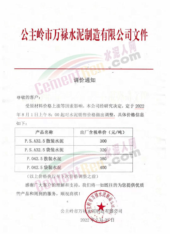 公主嶺市萬祿水泥制造有限公司通知自8月1日上午8時起對水泥銷售價格做出調整。調整后P.O42.5散裝水泥報價380元/噸。