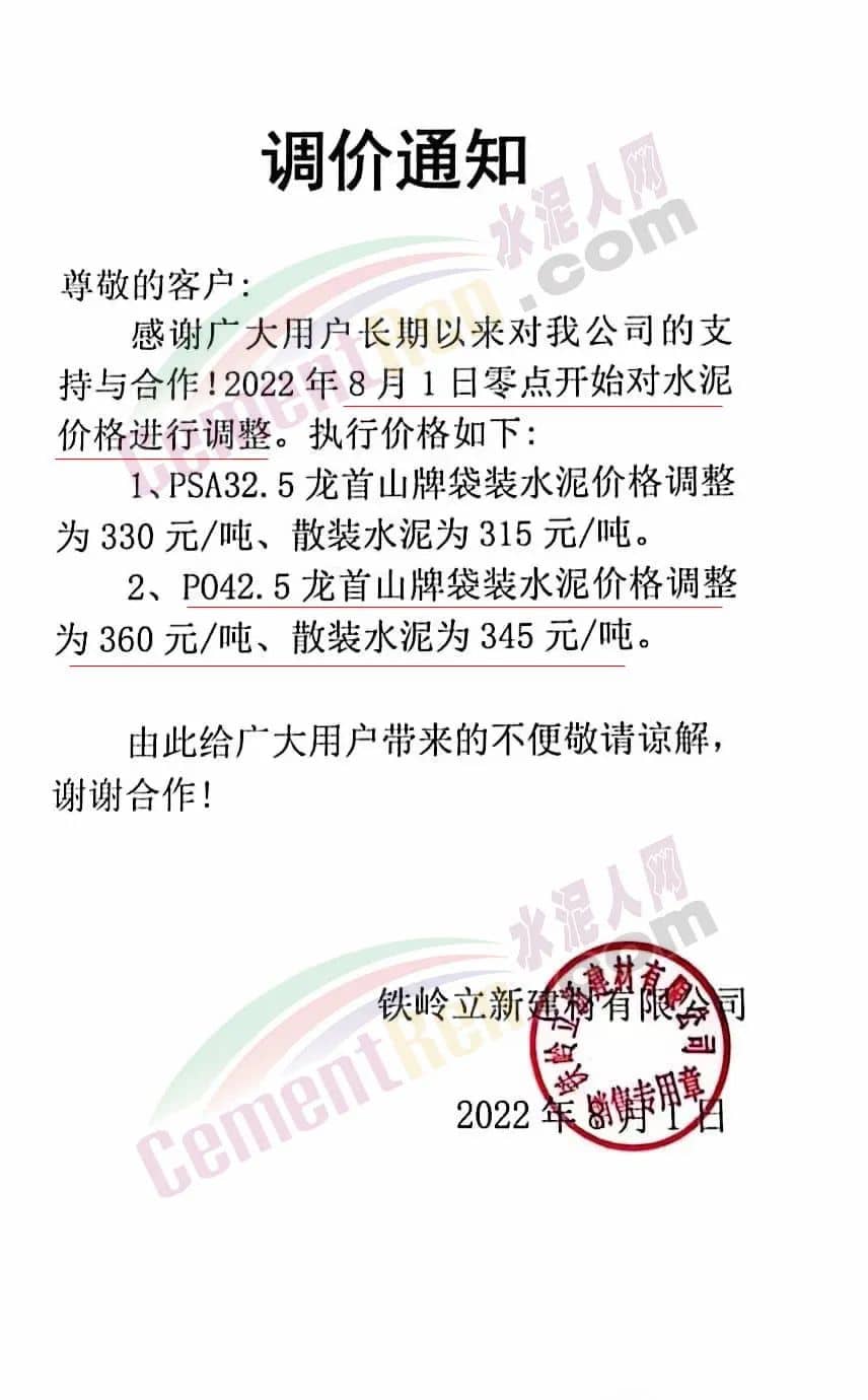 鐵嶺立新建材有限公司通知自8月1日零點開始對水泥價格進行調整,調整后PSA32.5A龍首山袋裝水泥為330元/噸,散裝水泥為315元/噸。P.O42.5龍首山牌袋裝水泥為360元/噸,散裝水泥為345元/噸。