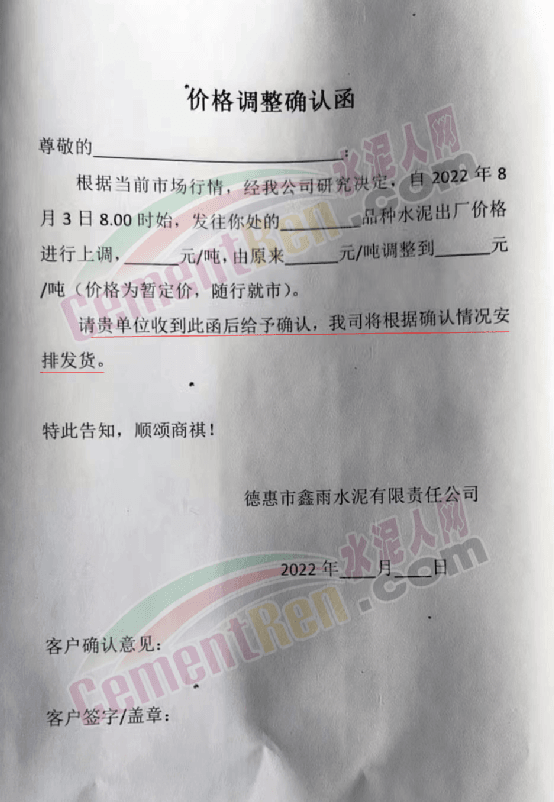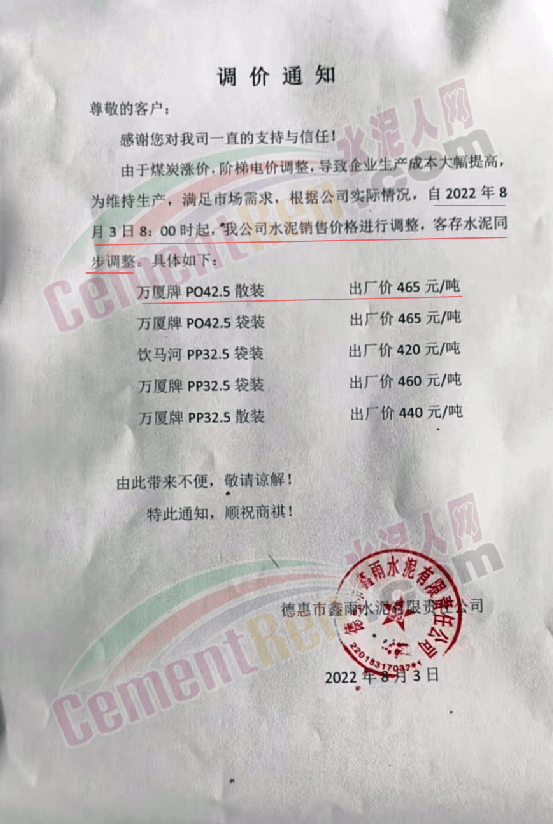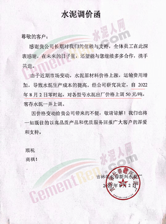 吉林省長春新興水泥廠通知,由于市場變動,水泥原材料價格上漲,運輸費用增加,導(dǎo)致水泥成本提高。經(jīng)公司研究決定自8月2日零時起,對各型號水泥出廠價格上調(diào)50元/噸,客存水泥一并上調(diào)。