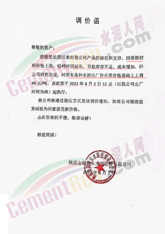 陜西關(guān)中主要品牌企業(yè)通知,上調(diào)水泥價格40元/噸,其中金隅冀東經(jīng)貿(mào)有限公司通知,因原燃材料價格上漲,錯峰時間延長,導(dǎo)致庫存不足,成本增加,經(jīng)公司研究決定,對所有品種水泥出廠價在原價格基礎(chǔ)上上調(diào)40元/噸。該政策于8月2日12點起執(zhí)行。公司將通過微信方式發(fā)送調(diào)價通知,如繼續(xù)提貨則視為同意接受新價格。