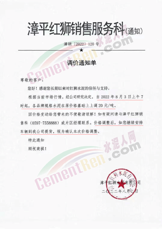 漳平紅獅銷售服務(wù)科調(diào)價通知稱,根據(jù)當(dāng)前市場行情 ,經(jīng)公司研究決定,自8月3日上午7時起,各品牌規(guī)格水泥在原價基礎(chǔ)上上調(diào)20元/噸。價格調(diào)整后,如繼續(xù)安排車輛內(nèi)到公司提貨,視為確認(rèn)本次價格調(diào)整。