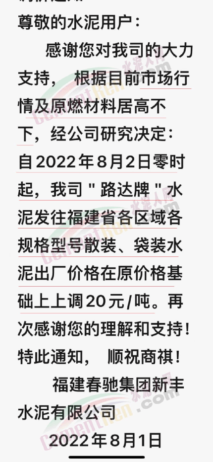 福建春馳集團新豐水泥有限公司通知根據(jù)目前市場行情及原燃材料居高不下,經(jīng)公司研究決定自8月2日零時起,公司“路達(dá)”牌水泥發(fā)往福建省各區(qū)域各規(guī)格型號散裝、袋裝水泥出廠價格在原價基礎(chǔ)上上調(diào)20元/噸。