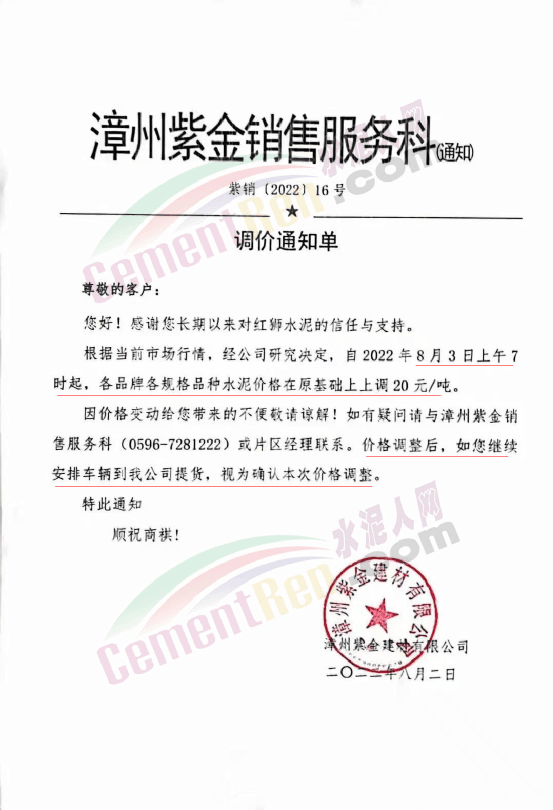 漳州紫金銷售服務(wù)科通知,根據(jù)當(dāng)前市場行情,經(jīng)公司研究決定,自8月3日上午7時起,各品牌各規(guī)格品種水泥價格在原基礎(chǔ)上上調(diào)20元/噸。價格調(diào)整后,如繼續(xù)安排車輛到公司提貨,視為確認(rèn)本次價格調(diào)整。