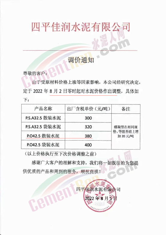 吉林四平佳潤水泥有限公司通知8月2日零時起對水泥價格作出調(diào)整,調(diào)整后P.O42.5散裝水泥報價380元/噸,緩凝型在相同規(guī)格等級報價基礎(chǔ)上增加20元/噸。