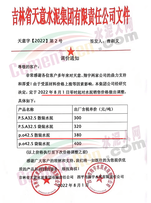 吉林天意水泥集團通知,由于受原材料價格上漲等因素影響,集團公司研究決定自8月1日起對水泥銷售價格作出調(diào)整,調(diào)整后P.O42.5散裝水泥出廠含稅價報380元/噸。