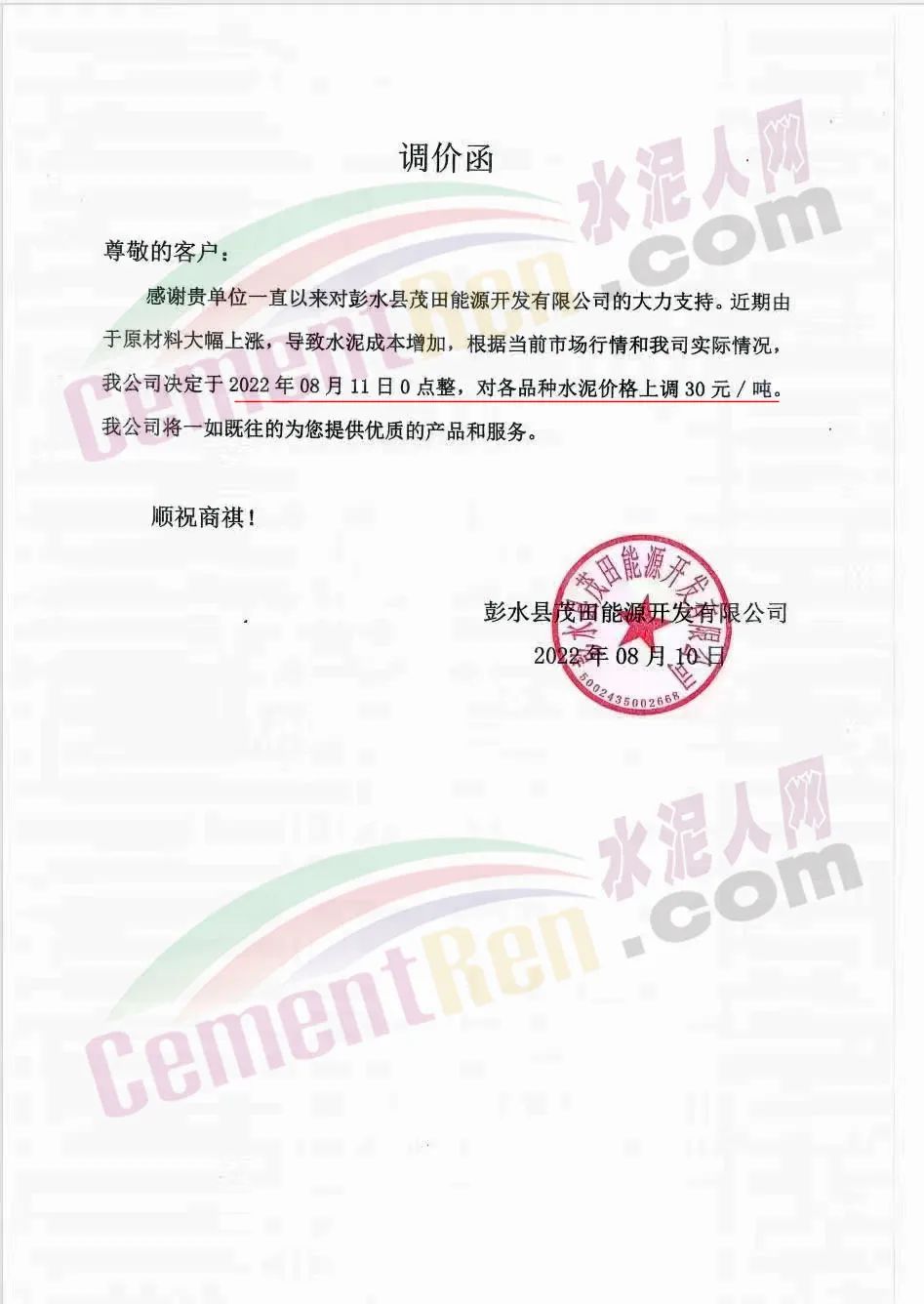 重慶彭水縣茂田能源開發有限公司調價函提到,由于原材料大幅上漲,導致水泥成本增加,根據當前行情和公司實際情況,決定于8月11日0點整,對各品種水泥價格上調30元/噸。