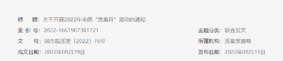 日前,國(guó)家市場(chǎng)監(jiān)管總局發(fā)布《關(guān)于開(kāi)展2022年全國(guó)“質(zhì)量月”活動(dòng)的通知》(國(guó)市監(jiān)質(zhì)發(fā)〔2022〕76號(hào))提到,市場(chǎng)監(jiān)管總局等21個(gè)部門(mén)定于2022年9月聯(lián)合開(kāi)展全國(guó)“質(zhì)量月”活動(dòng)。活動(dòng)主題為“推動(dòng)質(zhì)量變革創(chuàng)新 促進(jìn)質(zhì)量強(qiáng)國(guó)建設(shè)”。