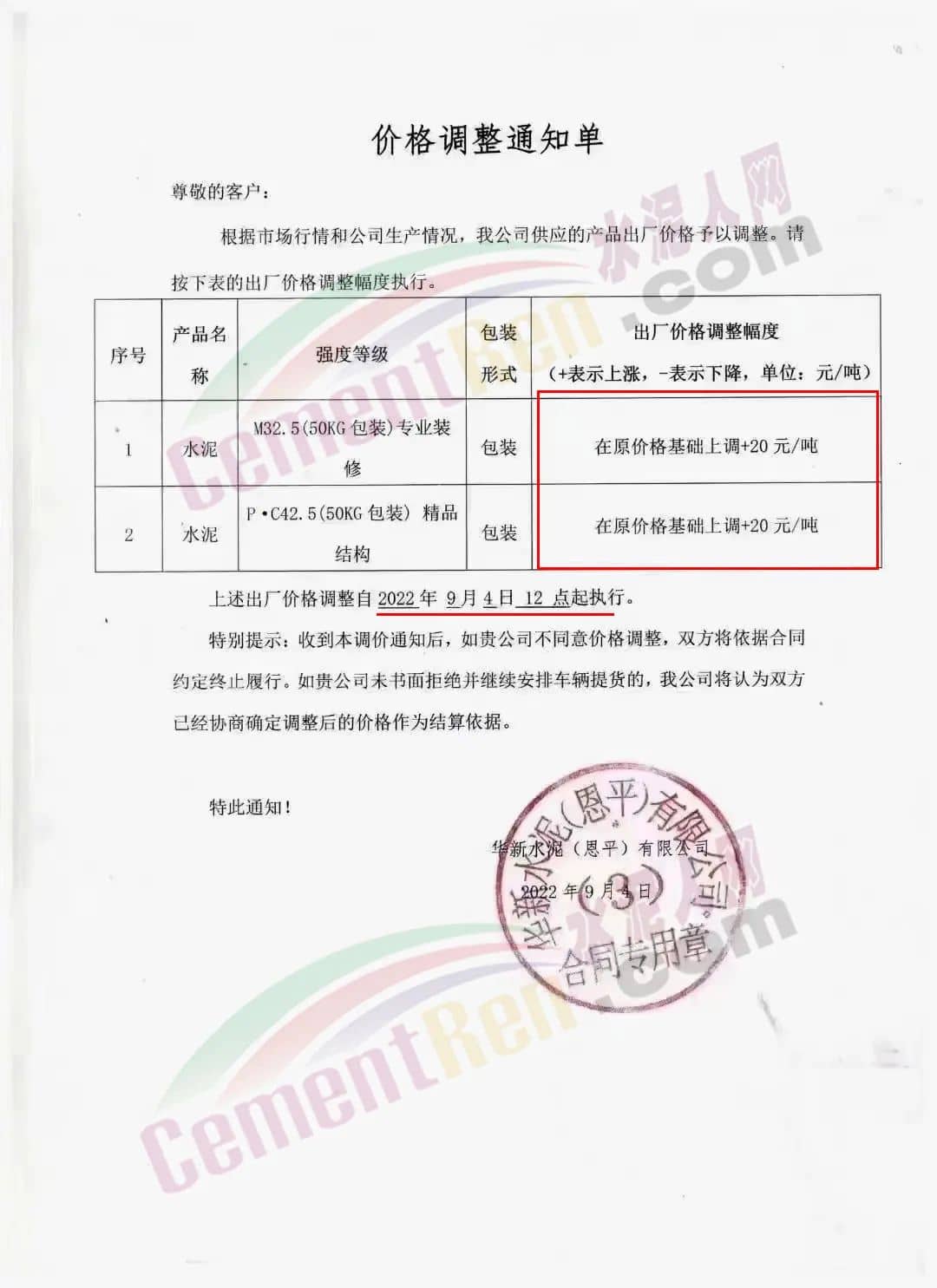 華新水泥(恩平)有限公司通知,自9月4日12點起旗下M32.5包裝專業裝修、PC42.5包裝精品結構水泥在原價基礎上上調20元/噸。
