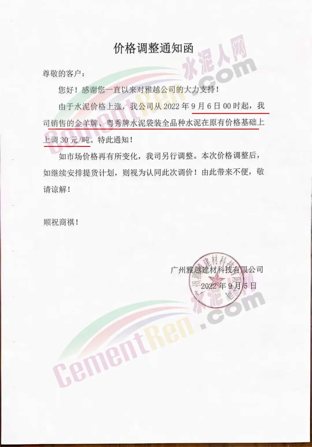廣州雅越建材科技有限公司通知,由于水泥價格上漲,公司從9月6日0時起,公司銷售的金羊牌、粵秀牌水泥袋裝全品種水泥在原價格基礎上上調30元/噸。