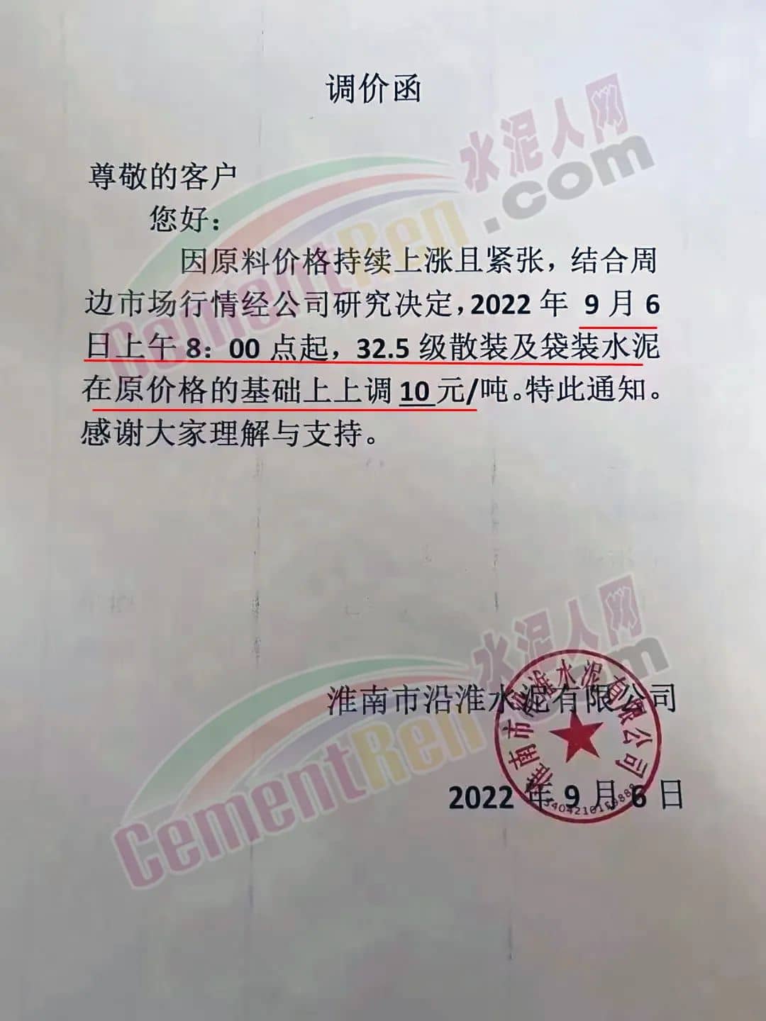 華潤水泥投資公司通知,9月7日0時起,公司江門銷售區域全品種袋裝水泥價格上調10元/噸,P.II42.5(R)散裝水泥價格上調10元/噸;從9月6日0時起,公司廣州各銷售區域全品種袋裝水泥上調20元/噸;對東莞及深圳區域全品種袋裝水泥價格上調10元/噸。