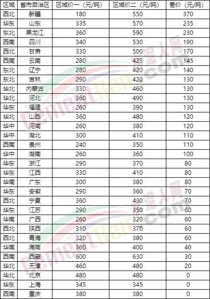 吉林、浙江、安徽、江蘇、云南、遼寧、福建、河南、湖南、廣西、貴州、新疆等12個地區區域一價格在300元/噸以下;重慶、黑龍江、河北、山西、寧夏、四川、山東、甘肅、內蒙古、江西、青海、陜西等28個省市自治區均價在國家統計局公布的流通領域報價384.3元/噸以下。