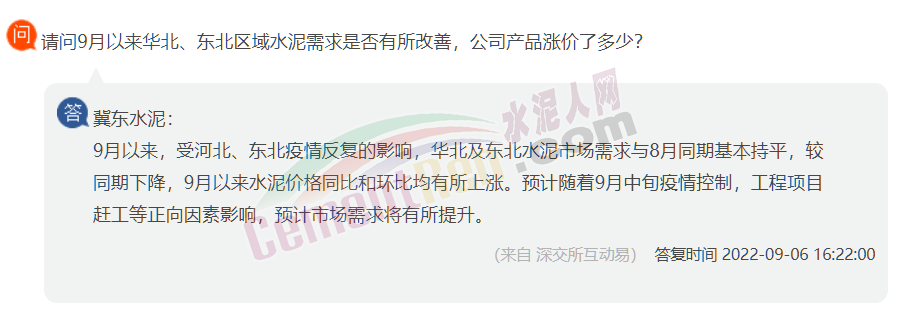 另有投資者提問,9月以來華北、東北區域水泥需求是否有所改善,公司產品漲價了多少?冀東水泥回復稱,9月以來,受河北、東北疫情反復的影響,華北及東北水泥市場需求與8月同期基本持平,較同期下降,9月以來水泥價格同比和環比均有所上漲。
