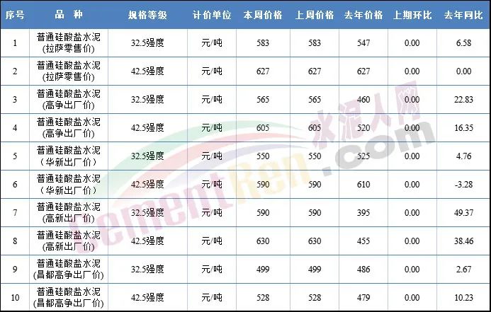 9月15日,西藏發改委公布的拉薩市場主要建材價格周報顯示因拉薩市疫情防控靜默管理,建材市場暫時關閉,本周拉薩市場的28種主要建材價格與去年同比,“8降19升1平”,價格以漲為主。其中42.5標號水泥出廠價在528-630元/噸之間,報價以華新水泥和高爭水泥為主。其中,高新出廠價同比上年同期上漲38.46元/噸,報價630元/噸。