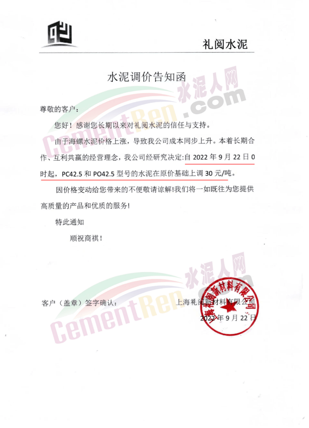 日前,由于海螺水泥價格上漲,上海禮閱新材料有限公司發布調價通知稱,導致公司成本同步上升,經公司研究決定自9月22日0時起,PC42.5和PO42.5型號的水泥在原價基礎上上調30元/噸。