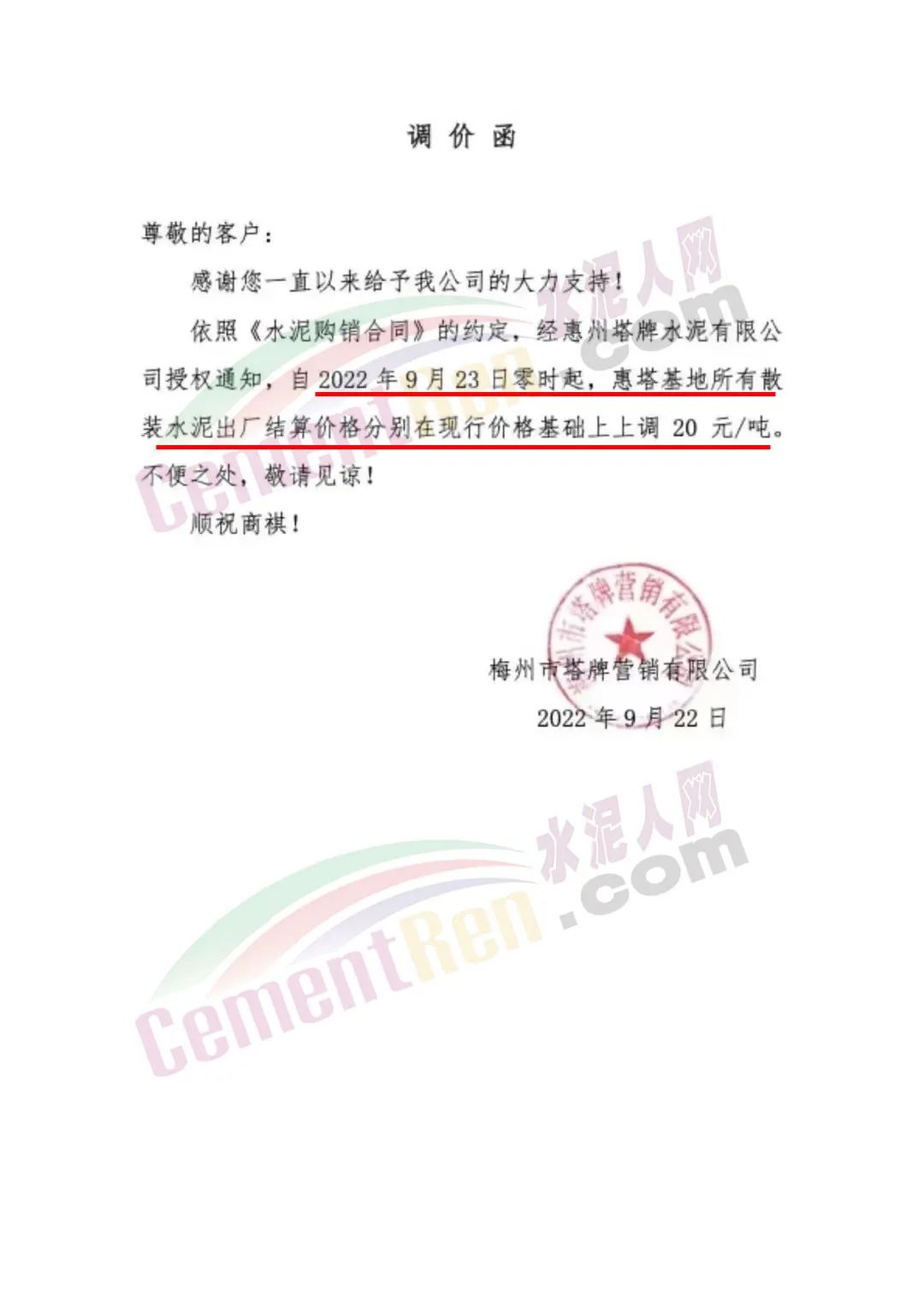 同期,區域內海螺水泥通知自2022年9月21日中午12:00起對各區域各市場客戶,PC42.5包裝水泥和M32.5包裝水泥均上調50元/噸。