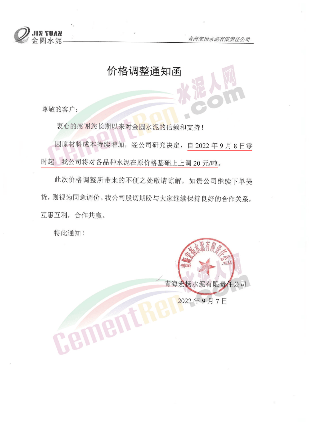 青海宏揚水泥有限責任公司通知,因原材料成本持續增加,經公司研究決定自9月22日零時起,公司將對各品種水泥在原價基礎上上調30元/噸。據水泥人網了解,這是該企業本月內第二次上調水泥價格,兩次累計上調50元/噸。