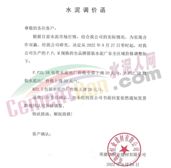 佛岡縣金峰水泥有限公司發(fā)布通知稱:因原材料市場價格變動,從2022年9月28日00:00起,我司所有品牌PO42.5R水泥、PP32.5R水泥原價格基礎(chǔ)上上調(diào)20元/噸。