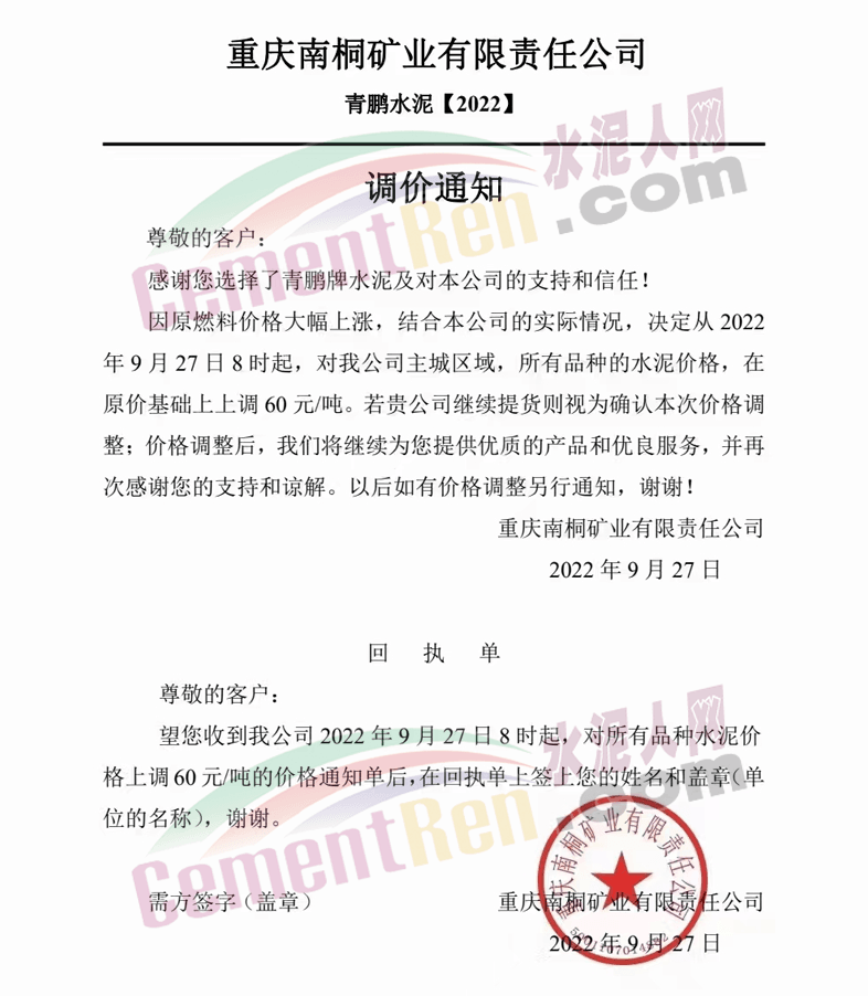 重慶南桐礦業(yè)有限責任公司發(fā)布通知稱:因原燃料價格大幅度上漲,結(jié)合本公司的實際情況,決定從2022年9月27日8時起,對我公司主城區(qū)域,所有品種的水泥價格,在原價格基礎(chǔ)上上調(diào)60元/噸。