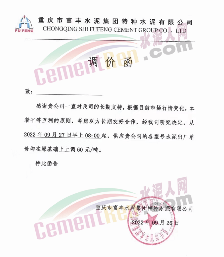 重慶市富豐水泥集團特種水泥有限公司發(fā)布通知稱:根據(jù)目前市場行情變化,經(jīng)我司研究決定,從2022年9月27日早上8:00起,供應貴公司各型號水泥出廠價格在原基礎(chǔ)上上調(diào)60元/噸。