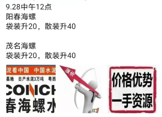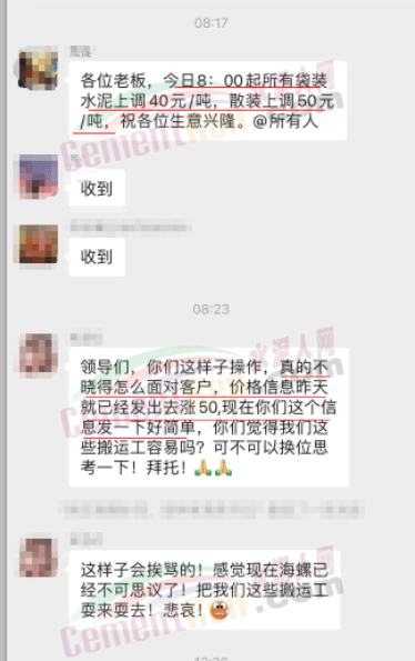 海螺水泥經銷商打款群里通知調價的信息是在8點17分,通知是自8點起上調40-50元/噸。前一日司機群里的通知是“25日8時上調50元/噸,后經研討決定,改為26日8點各品種上調30元/噸。”