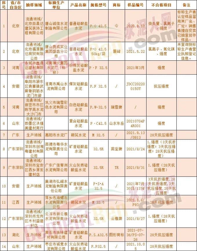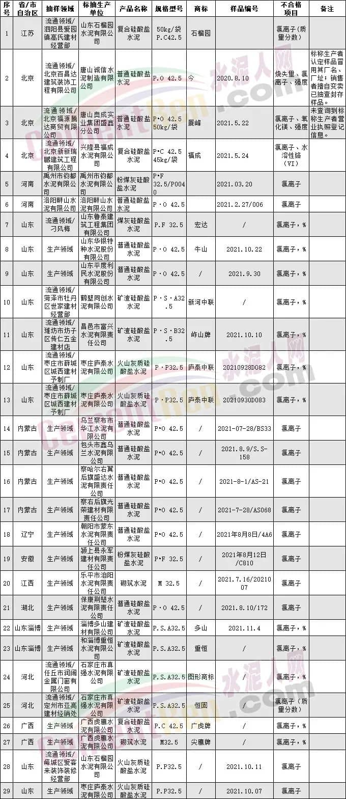 北京市市場監督管理局公示:3組批水泥產品不合格,不合格項目涉及氯離子、強度、燒失量