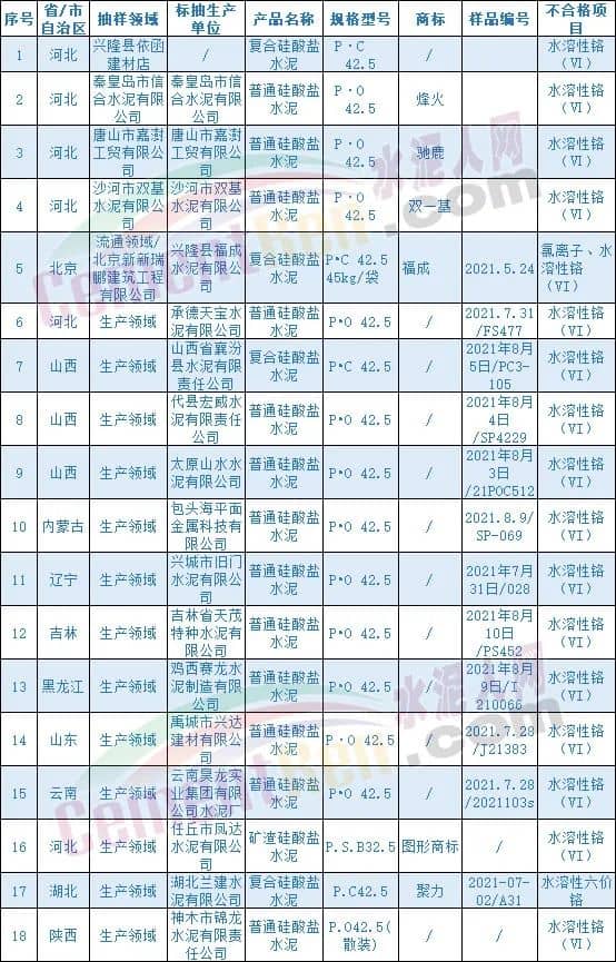 青海省市場監督管理局6月10日消息,2021年,青海省市場監督管理局以推動高質量發展為目標,聚焦民生與安全,突出問題導向,圍繞重點工業產品質量安全監管,組織開展了產品質量省級監督抽查工作。抽查結果顯示個別硅酸鹽水泥存在水溶性鉻(VI)、氯離子超標,對工程質量和生態環境造成了安全隱患。