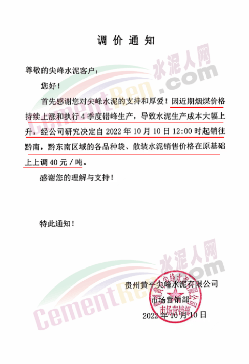 貴州黃平尖峰水泥通知,因近期煙煤價格持續上漲和執行4季度錯峰生產,導致水泥生產成本大幅上升,經公司研究決定自10月10日起銷往黔南、黔東南以及遵義區域的各品種水泥價格上調40元/噸。