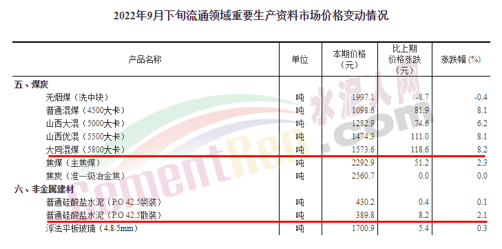 10月9日,國家統計局公布了2022年9月下旬流通領域重要生產資料市場價格變動情況,水泥人網注意到流通領域煤炭價格仍處于上行趨勢,各類型煤炭報價仍處于1000元/噸以上,其中5800大卡山西大同混煤報價1573.6元/噸,較上期上漲118.6元/噸;同比上年同期報價1289.1元/噸,上漲284.5元/噸。同期P.O42.5散裝水泥報價389.8元/噸,上漲8.2元/噸,漲幅2.1%,仍未突破400元/噸大關;同比上年同期547.8元/噸報價下跌158元/噸。