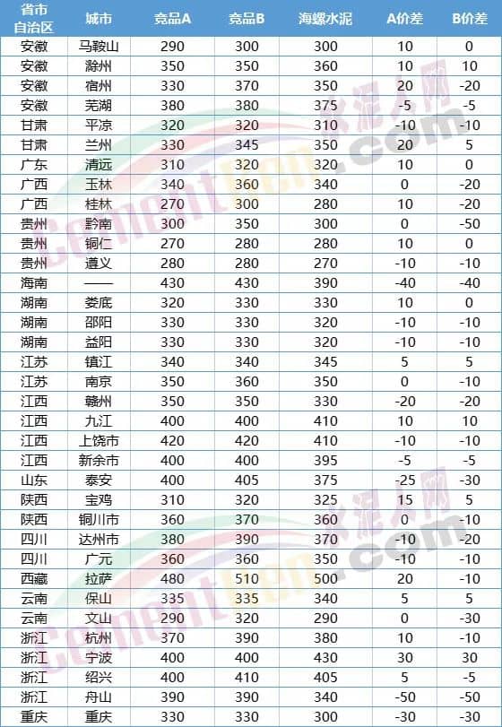 各區(qū)域海螺水泥與競(jìng)品報(bào)價(jià)對(duì)比