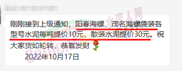 同日,廣東區域經銷商通知,陽春海螺、茂名海螺袋裝各型號水泥報價上調10元/噸,散裝水泥上調30元/噸。