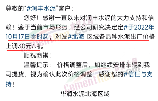 華潤水泥北海區域通知10月17日零時起,對發北海區域各品種水泥出廠價格上調30元/噸。
