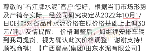 崇左南方銷售部通知,根據當前市場形勢,經研究決定公司于10月17日0點對廣西區域各品種水泥價格上調30元/噸。
