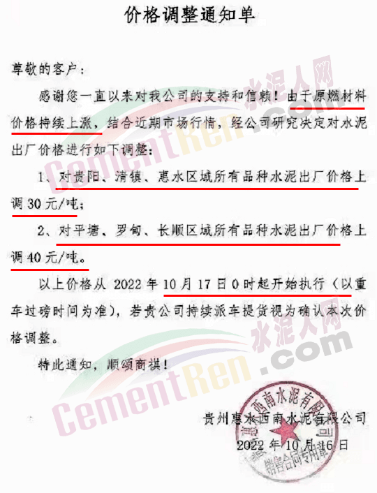 貴州麟山水泥有限公司通知,自10月16日0時起,公司各品種水泥出廠單位在原執行價格基礎上上調40元/噸。