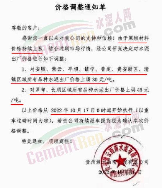 貴州紫云西南水泥有限公司通知,由于原燃材料價格持續上漲,結合近期市場行情,經公司研究決定10月17日0時起對安順、紫云、平壩、鎮寧、普定、貴安新區、清鎮區域所有品種水泥出廠價上調30元/噸。對羅甸、長順區域所有品種水泥出廠價上調45元/噸。