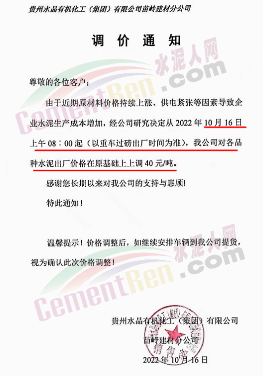 貴州水晶有機化工(集團)有限公司苗嶺建材分公司通知,由于近期原材料價格持續上漲、供電緊張等因素導致企業水泥生產成本增加,經公司研究決定從10月16日上午8時起,公司對各品種水泥出廠價上調40元/噸。