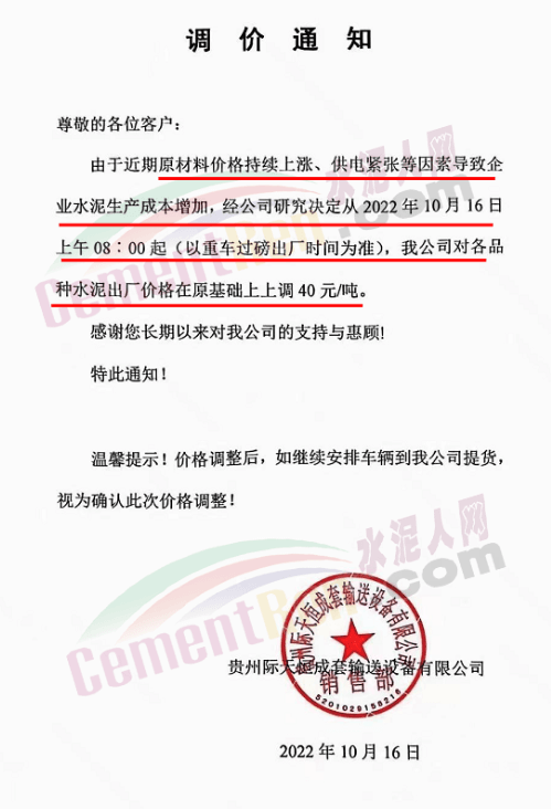 貴州際天恒成套輸送設備有限公司通知,由于近期原材料價格持續上漲、供電緊張等因素導致企業水泥生產成本增加。經公司研究決定從10月16日上午8時起,對各品種水泥出廠價上調40元/噸。