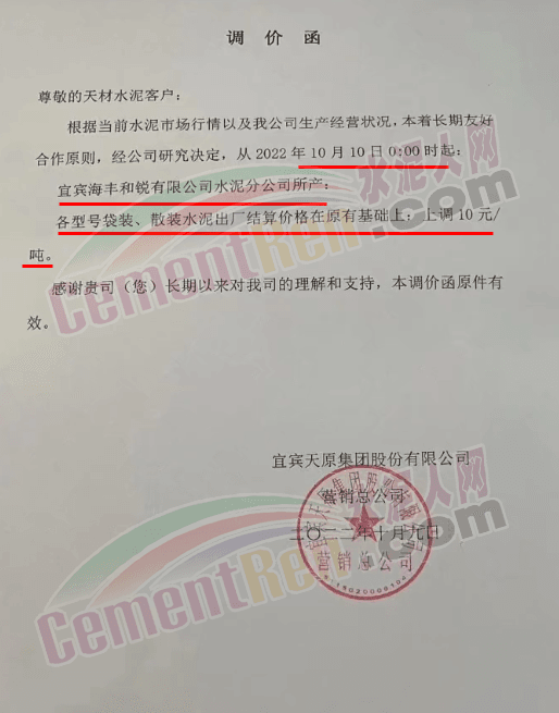 四川宜賓市天順建材集團股份有限公司通知自10月16日零時起,所有區域各品種水泥價格上調50元/噸。