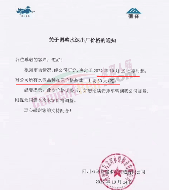 四川雙馬宜水泥制造有限公司通知10月15日零時起對公司所有水泥品種上調50元/噸。