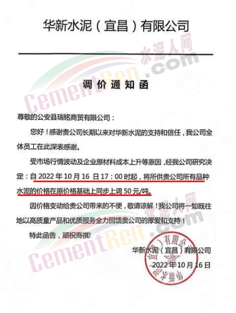 湖北華新水泥(宜昌)有限公司通知10月16日17時起,各標號水泥上調50元/噸。