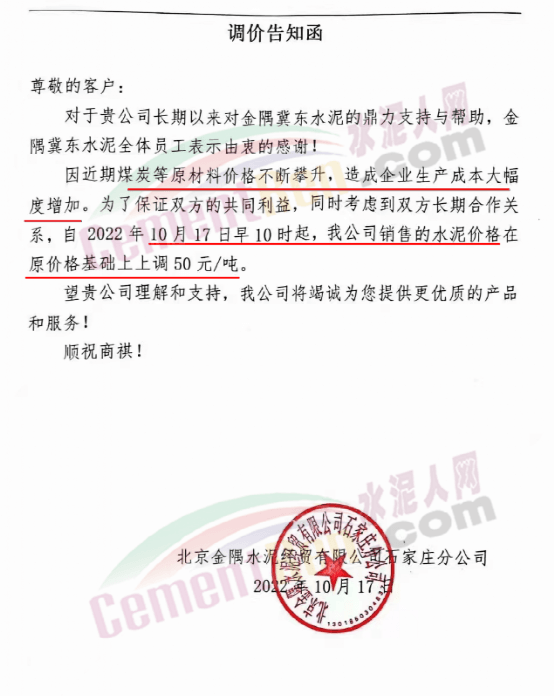 北京金隅水泥經貿有限公司石家莊分公司通知,因近期煤炭等原材料價格不斷攀升,造成企業生產成本一大幅度增加。自10月17日早10時起,公司銷售的水泥價格在原基礎上上調50元/噸。