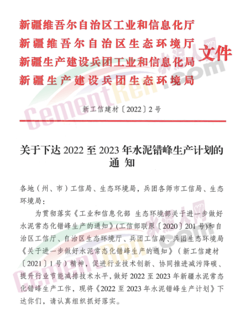 新疆維吾爾自治區發《關于下達2022至2023年水泥錯峰生產計劃的通知》稱,為持續做好新疆水泥常態化錯峰生產工作,在充分調研全疆各地采暖期長短、空氣質量情況、各水泥企業對錯峰生產時間的意見建議及下一年度水泥市場需求情況的基礎上,特制定2022至2023年水泥錯峰生產計劃。