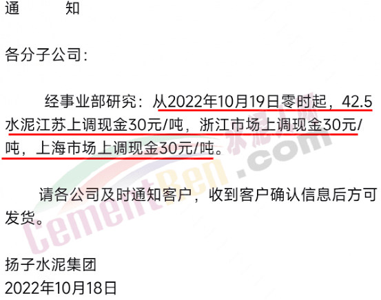 揚子水泥集團通知,經事業部研究,從10月19日零時起,42.5水泥江蘇上調30元/噸,浙江市場上調30元/噸,上海市場上調30元/噸。