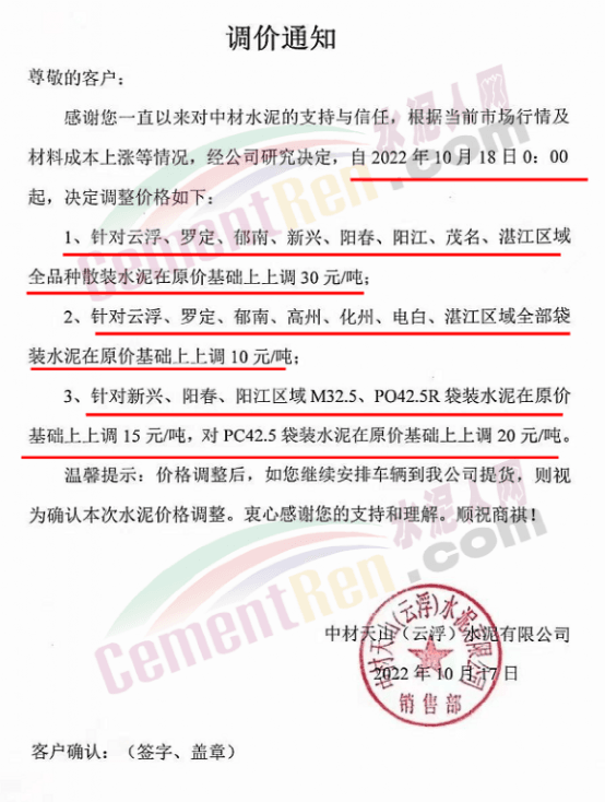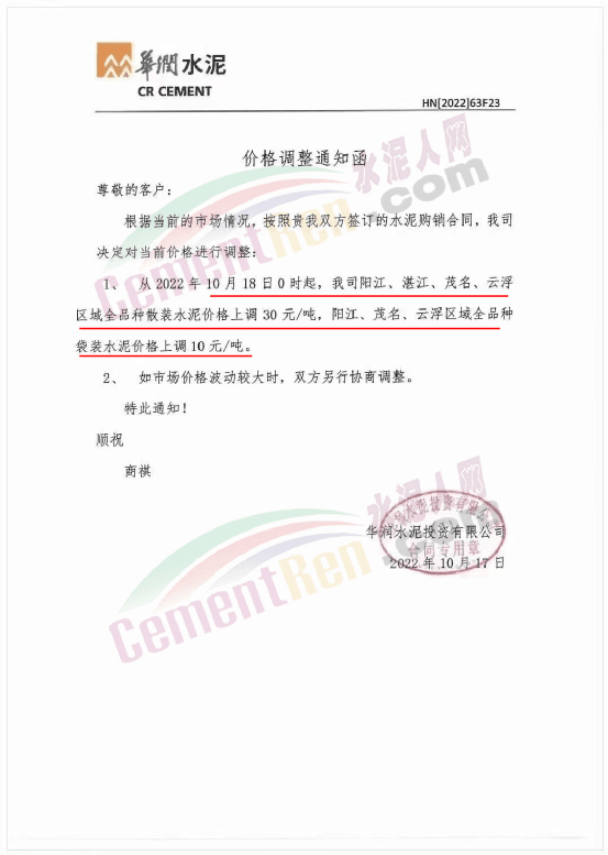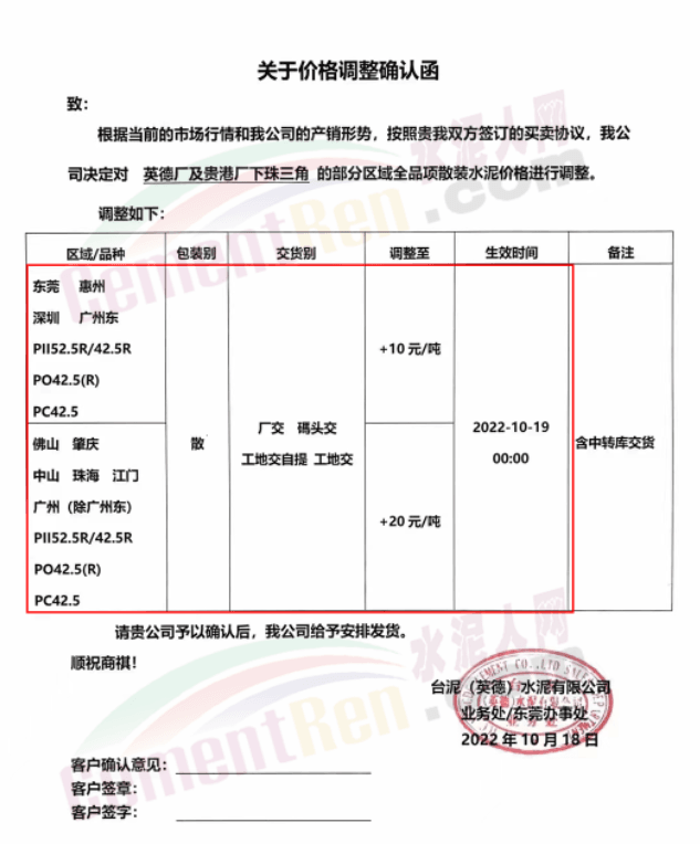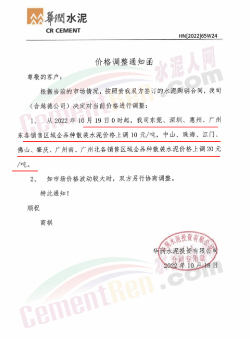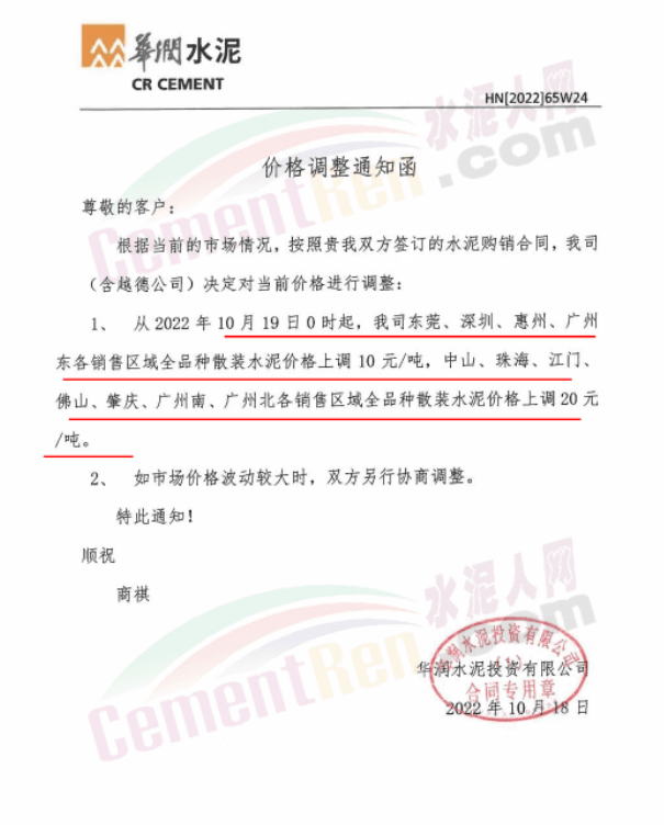 與此同時,珠三角區域中材天山、中材亨達、華潤水泥、臺泥水泥、塔 牌水泥、光大水泥、青洲水泥等水泥企業通知上調水泥價格10-30元/噸,下游商混企業紛紛跟進。