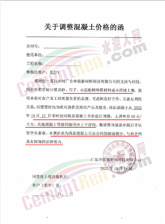 珠海三潤混凝土有限公司、珠海文冠商品混凝土有限公司、珠海市志隆商品混凝土有限公司、珠海市潤濠商品混凝土有限公司、廣東中聯新材料科技有限公司、珠海市錦龍混凝土有限公司、珠海凌宇混凝土有限公司等近十家混凝土企業通知稱,由于廣東海事局對航道及船舶要求嚴禁卸貨等因素影響,直接導致了砂、石子、水泥等原材料價格不同程度上漲。其中水泥分別于2022年9月23日上調20元/噸,9月29日上調30元/噸,10月13日上調10元/噸,累計上調60元/噸,導致了混凝土生產成本急劇增加。為確保建筑工程混凝土質量不受影響,混凝土公司決定各項目各等級混凝土及砂漿價格在原結算單價基礎上上調50元/m³。且強調此次調價是根據原材料市場行情,不以《珠海工程造價信息》為準。同時提到,因原材料緊缺或無貨造成的混凝土供應困難,也請客戶理解、支持與配合。