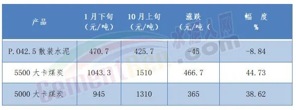 國家統計局數據顯示,今年1月下旬至10月上旬 P.O42.5散裝水泥市場均價下跌45元/噸,跌幅為8.84%;5500大卡煤炭價格卻上漲了466.7元/噸;5000大卡煤炭價格上漲了365元/噸;漲幅分別為44.73%和38.62%。