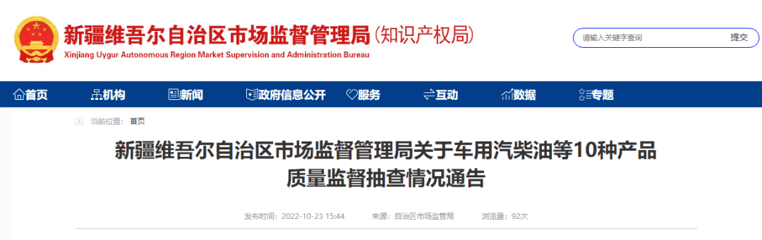 10月23日,新疆維吾爾自治區市場監督管理局發布關于車用汽柴油等產品質量監督抽查情況通告。