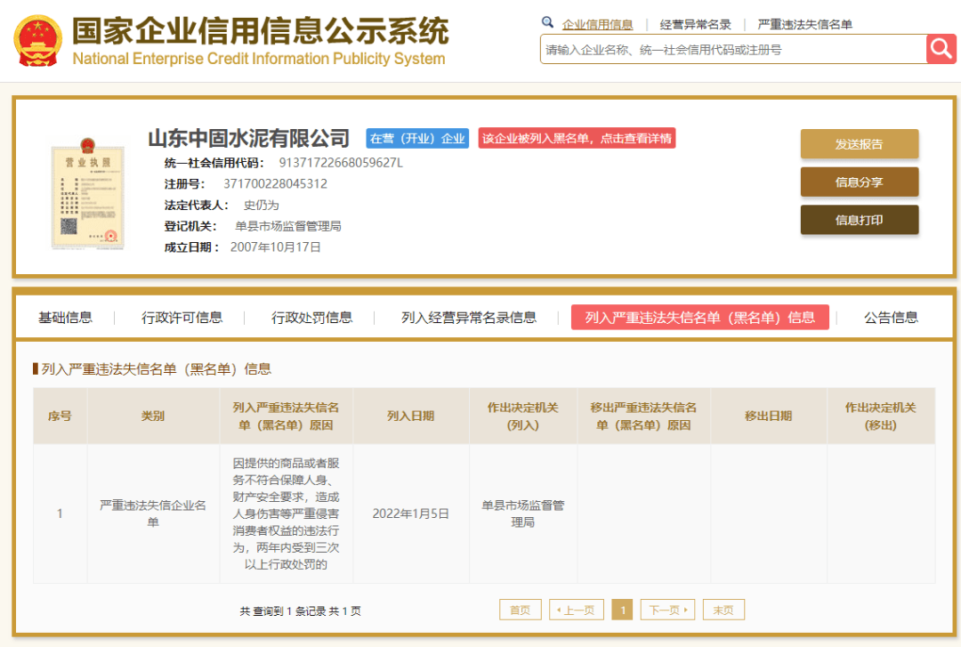 今年3月中旬,國家市場監管總局曾集中曝光一批嚴重違法失信名單典型案例涉及食品、重要工業產品和知識產權等領域。其中包括山東中固水泥有限公司生產不合格水泥案。
