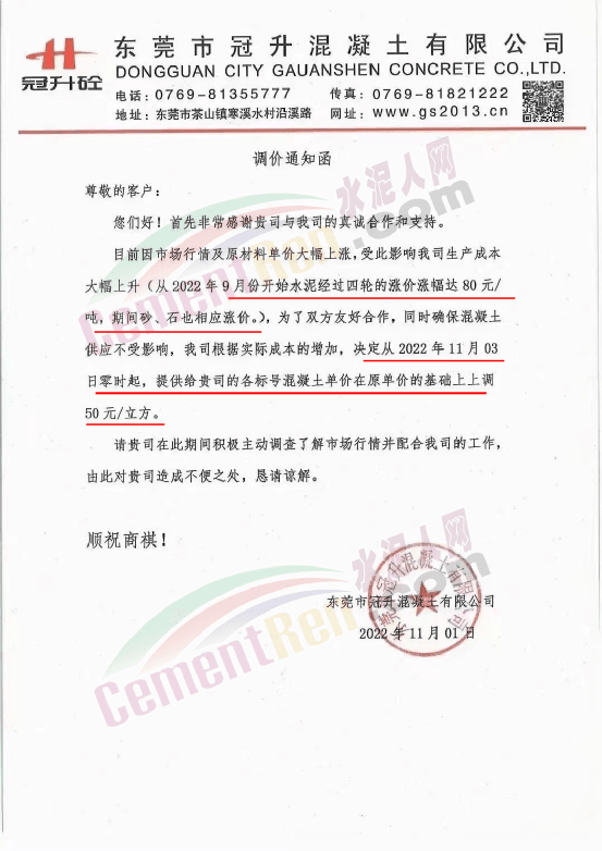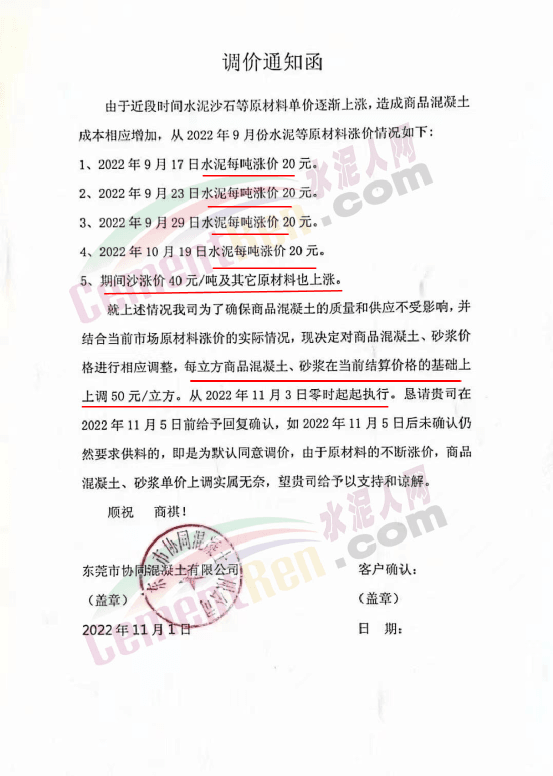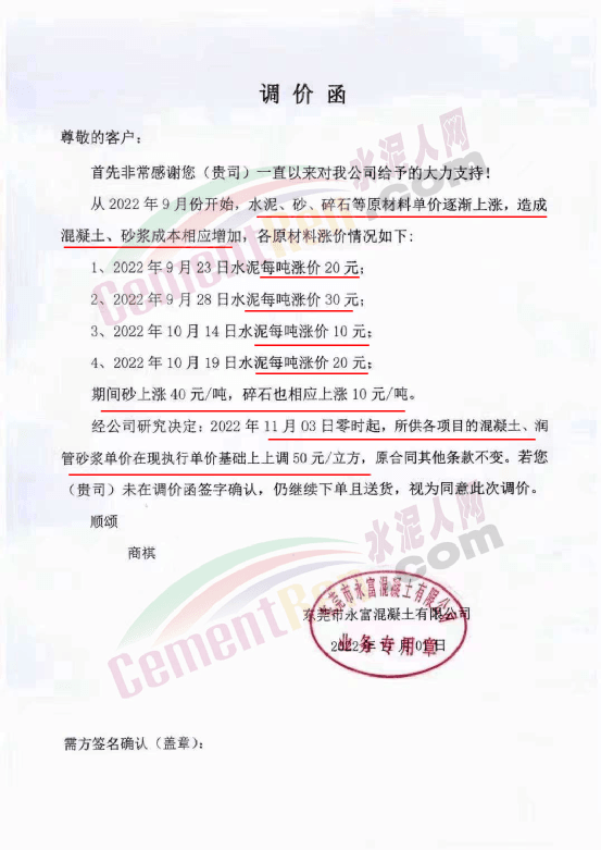 企業調價通知稱,從9月份開始,水泥、砂石等原材料上漲,造成混凝土企業生產成本增加,其中水泥4輪連漲,累計上漲80元/噸,砂上漲40-50元/噸,碎石上漲8-10元/噸。混凝土企業所供各項目的混凝土、砂漿價格跟進上調50元/噸。