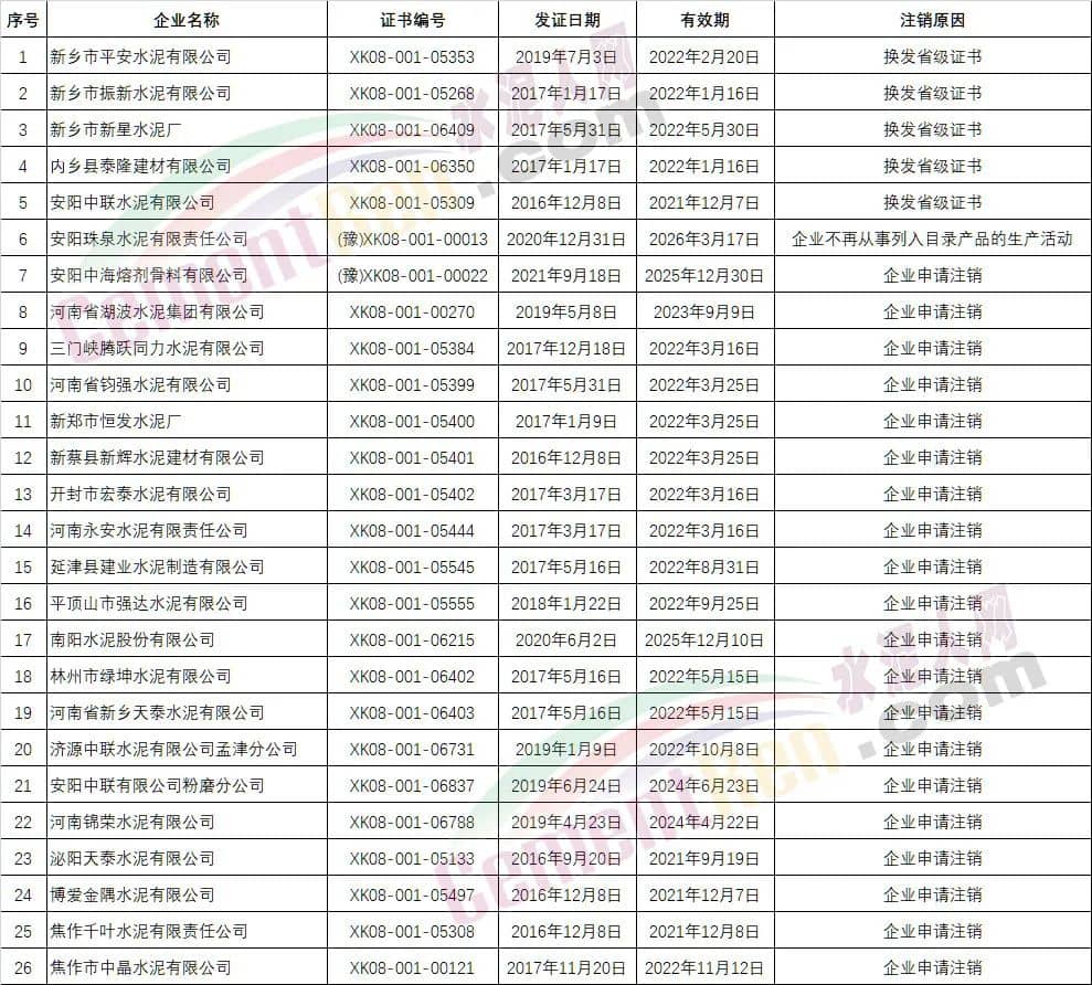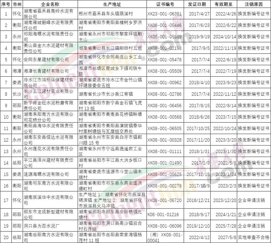 湖南省20家企業生產許可證注銷,16家水泥企業換發新編號證書,3家企業申請注銷,1家企業實地審查不合格;