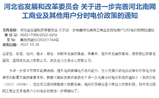 10月28日,河北省發(fā)改委發(fā)布《關(guān)于進(jìn)一步完善河北南網(wǎng)工商業(yè)及其他用戶分時(shí)電價(jià)政策的通知》要求,自2022年12月1日起執(zhí)行,平段電價(jià)按市場(chǎng)交易購(gòu)電價(jià)格或電網(wǎng)代理購(gòu)電平均上網(wǎng)價(jià)格執(zhí)行,高峰和低谷時(shí)段用電價(jià)格在平段電價(jià)基礎(chǔ)上分別上下浮動(dòng)70%;尖峰時(shí)段用電價(jià)格在高峰電價(jià)基礎(chǔ)上上浮20%。